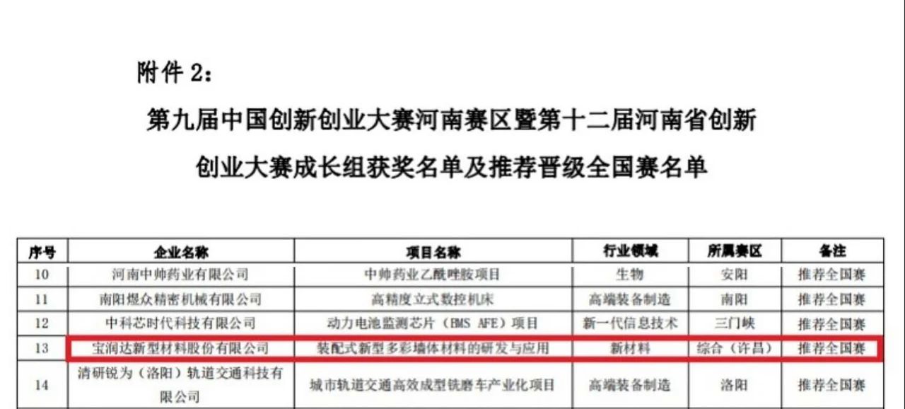 近日,第九届中国创新创业大赛河南赛区暨第十二届河南省创新创业大赛热烈举办,在获奖公示的企业名单中,宝润达《装配式新型多彩墙体材料的研发与应用》获得强力推荐,晋级全国赛!